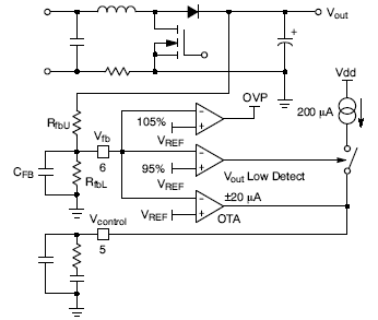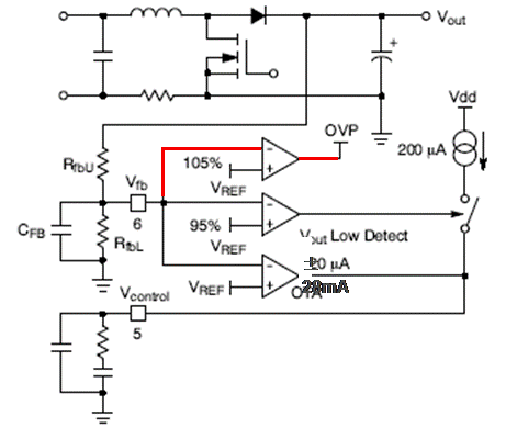 2. 快速瞬態響應/過壓保護(OVP):當VFB > 105% VPREF時,過壓保護激活,驅動器輸出變為低電平;當VFB低于103.2% VPREF時,器件自動恢復工作。