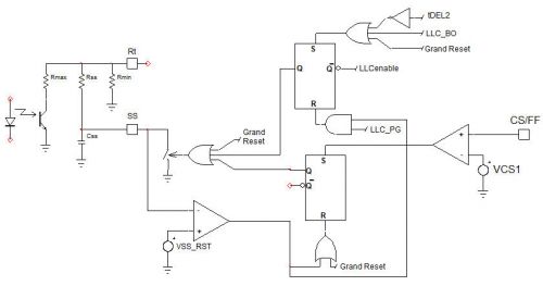 2. 完整軟啟動:SS引腳接地條件是:啟動,或CS/FF高于VCS1(1 V),或BO激活,或tDEL2結束。僅在VSS低于VSS(RST)時,SS引腳上的開關被釋放開路,執行從啟動(重啟)開始的完整軟啟動。