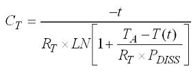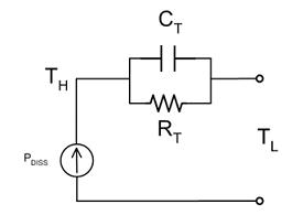 該模擬可以深入進行,以描述器件的另一個熱屬性,稱之為熱容。正如將熱阻模擬為電阻,可以將熱容(CT,單位為J/℃)模擬為電容。將熱容與熱阻并聯(lián)獲得熱阻抗(ZT)。圖1所示為傳導(dǎo)傳熱的簡化RC模型。能源被模型化為電流源,熱阻抗被模型化為CT與RT并聯(lián)。
