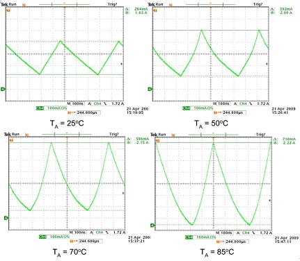 圖4左上圖顯示了在飽和點以下工作的電感器,具有正常的三角電流波形,可由(V/L×Δt)算出。在峰值電流保持相同且溫度升至50℃(右上圖)時,電感電流斜率開始增至1.76A標(biāo)記附近,指示顯示電感器的飽和點隨著溫度上升而向下移動。當(dāng)溫度升到70℃, 然后升到85℃時,隨著電感器達(dá)到飽和整個電流波形最終出現(xiàn)。