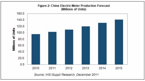 除了國家電網公司的招標活動以外,智能電表市場還受到其它一些因素的大力推動,其中包括出口不斷增長。2011年出口占到總體智能電表產量的將近三分之一。今年出口將達到3080萬只,國內消化的出貨量為7200萬只。