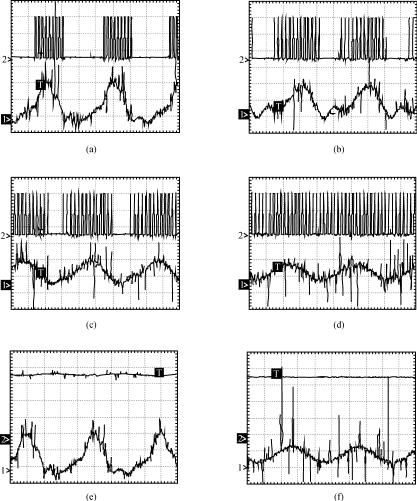 圖3(a)(b)(c)(d)示出了不同L、C參數(shù)時直流電源的控制脈沖和輸出電流。其中(a)為沒有LC濾波電路時的實驗波形,(b)的濾波參數(shù)為L=2mH、C=1100μF,(c)的濾波參數(shù)為L=2mH、C=2200μF,(d)的波波參數(shù)為L=2mH、C=3300μF。由圖可見,當(dāng)逆變器輸入側(cè)不加LC濾波器時,直流電源輸出電流大范圍波動,造成控制脈沖時有時無。其結(jié)果是系統(tǒng)噪聲變大,整機效率下降,可靠性降低。隨著LC濾波參數(shù)的加大,逆變器輸入電流的波動逐漸減小,控制脈沖逐漸變得連續(xù),系統(tǒng)噪音變小,效率變高。為了保證逆變器輸入電壓的穩(wěn)定,濾波電感不宜加的太大,增大濾波參數(shù)適宜加大濾波電容。