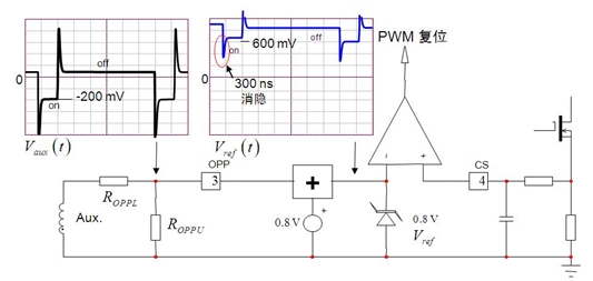如圖 1 所示,電路中的光耦合器斷路或 TL431 分壓器網(wǎng)絡(luò)遭受嚴(yán)重漂移影響(或其某個電阻丟失或出現(xiàn)錯誤值)時,輸出電壓就可能超出規(guī)定的限制值,這就是過壓條件。大多數(shù)情況下,過壓條件可能對下行負(fù)載有害,適配器這時必須完全關(guān)斷。NCP1250/1 在 OPP 引腳上也集成了 3 V 參考比較器,這比較器可用于多種功能,如 OVP。如果這 OPP 引腳電壓連續(xù)四次超過 3 V,就使控制器 IC 閂鎖保護(hù)。