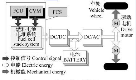 (1)串聯(lián)式—下圖中采用的電力電子裝置只有電機(jī)控制器,電池和輔助動(dòng)力裝置都直接并接在電機(jī)控制器的入口,屬于串聯(lián)式,車輛的驅(qū)動(dòng)力只來源于電動(dòng)機(jī)。