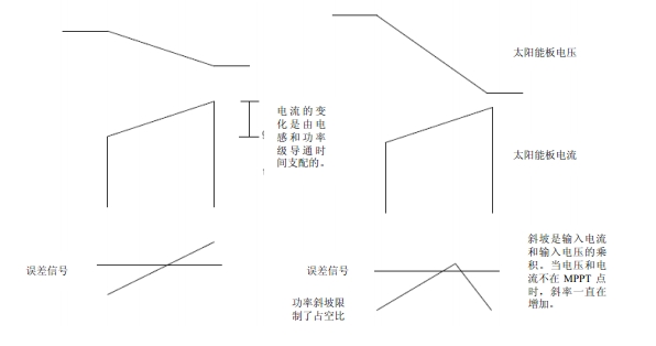 為了從功率可變的電源(即太陽能電池板)析取出最大的功率,太陽能控制器必須采用 MPPT。MPPT 必須首先找到最大功率點并及時調(diào)整環(huán)境條件,以保持控制器接近最大功率點。動態(tài) MPPT 用在系統(tǒng)發(fā)生改變的情況下。由于每個開關周期都在發(fā)生變化,太陽能電池板汲取的功率也會在每個周期有明顯的改變。動態(tài)MPPT利用太陽能電池板的電壓驟降乘以每個開關周期增加的電流,以確定將要產(chǎn)生的誤差信號來調(diào)節(jié)占空比。動態(tài)響應可檢測 IV 曲線的斜率,從而建立一個功率斜坡,從誤差信號相交點建立一個代表占空比的功率。當斜坡變化斜率從正到負時該周期結束,如圖 2 所示。