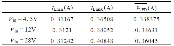 分別在V in = 2. 5V , V in = 28V 的情況下,再次對L ED 驅(qū)動電流進行仿真,三次仿真數(shù)據(jù)結(jié)果分別如表1 所示。