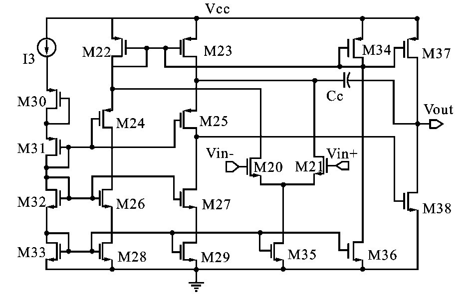 以上分析可知運算放大器起著重要作用,其必須具有較高的增益,才能使A 點電壓精確跟隨參考電壓,從而準確設(shè)定B 點電平和滯環(huán)電壓大小。 另外由于V out的變化頻率與系統(tǒng)開關(guān)頻率相同(系統(tǒng)的最大開關(guān)頻率約為2MHz) ,使得流過M1 的電流也相同頻率在IM1和I′M1之間快速切換,所以運放的單位增益帶寬須大于系統(tǒng)的最大開關(guān)頻率。 設(shè)計的運放結(jié)構(gòu)如圖4 所示,采用折疊式輸入結(jié)構(gòu),可以獲得較大的共模輸入電壓范圍。
