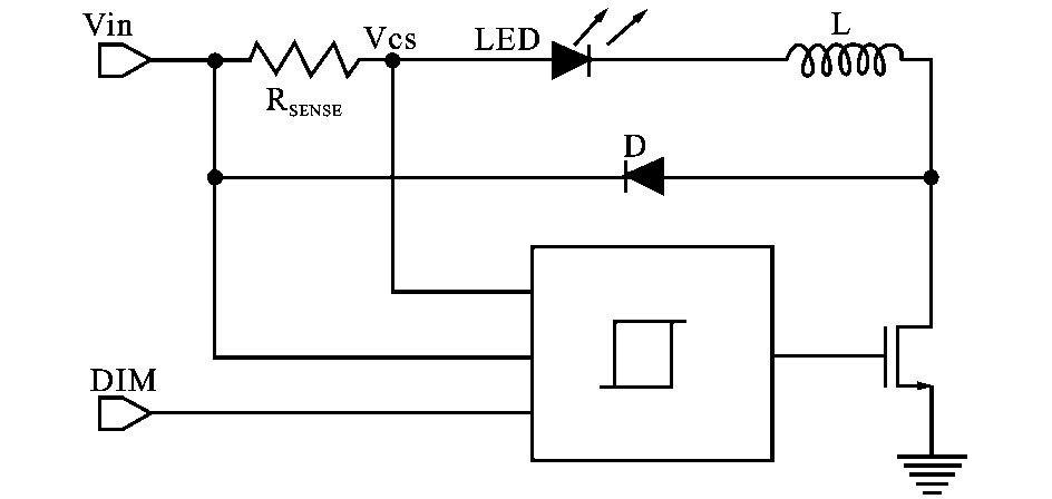 滯流控制模塊內(nèi)部電路如圖2 所示,當DIM 信號為高電平期間,當Vcs 大于上電壓閾值時,控制電路輸出低電平,關(guān)閉功率開關(guān)管。 由LED、電感L 、續(xù)流二極管D 和RSENSE組成的回路使得電感繼續(xù)為L ED 提供電流,電感電流逐漸減小,使得檢測電壓Vcs 隨之減小;當Vcs 小于下閾值電壓時,控制電路輸出高電平,導(dǎo)通功率開關(guān)管,此時D 截止,形成從電源經(jīng)RSENSE、L ED、L 和功率開關(guān)管到地的回路,電源為電感L 充電,電感電流上升,檢測電壓Vcs隨之升高。 Vcs 大于上電壓閾值時,控制電路關(guān)斷開關(guān)管,重復(fù)上個周期的動作,這樣就完成了對L ED驅(qū)動電流的滯環(huán)電流控制,使得流過L ED 的驅(qū)動電流,也就是電感電流的平均值恒定。