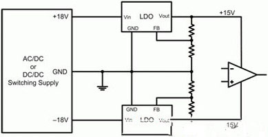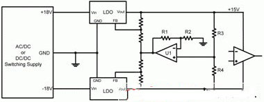 圖2顯示了一個(gè)典型運(yùn)算放大器電源電路的示意圖。此處,一個(gè)開(kāi)關(guān)電源提供一個(gè)正18V和一個(gè)負(fù)18V。兩低壓降(LDO)線性穩(wěn)壓器進(jìn)一步將±18V調(diào)節(jié)至±15V。該LDO一般安裝在電源和運(yùn)算放大器之間,旨在降低開(kāi)關(guān)電源產(chǎn)生的高頻開(kāi)關(guān)噪聲。LDO具有較高的電源抑制(以比率表示,PSRR),其減弱了寬帶頻率下LDO輸入的噪聲。