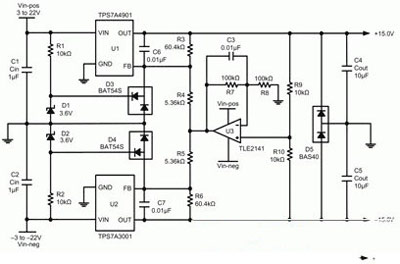 圖5所示電路使用一個(gè)如TPS7A3001等可調(diào)節(jié)、負(fù)輸出電壓LDO線性穩(wěn)壓器,以及如TPS7A4901等可調(diào)節(jié)、正輸出電壓LDO。U3、R7-R10和C3均為增加的組件,用于追蹤。R1、R2、D1-D5均為增加組件,用于將反饋引腳的電壓控制在其各自產(chǎn)品說(shuō)明書(shū)額定的絕對(duì)最大電壓范圍內(nèi)。