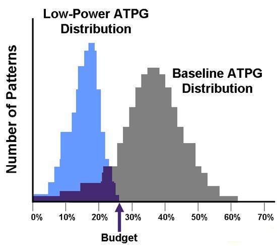 然而,如果我們采用相關(guān)技術(shù)降低測試期間的功耗,我們就能有效地將這種分布向左移。在圖1中重疊的藍(lán)色低功率分布區(qū),掃描ATPG向量的峰值開關(guān)活動沒有超過功率預(yù)算,因此降低了制造測試中功率問題產(chǎn)生的風(fēng)險。