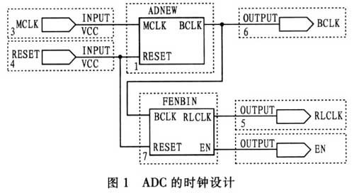 圖1示出A/D轉(zhuǎn)換器的輸入時(shí)鐘設(shè)計(jì),MD轉(zhuǎn)換器工作在從模式下時(shí),需要外部提供RLCLK和BCLK。在主時(shí)鐘MCLK的輸入下,通過(guò)對(duì)MCLK 4分頻得到BCLK的信號(hào),用來(lái)作為位數(shù)據(jù)提取的信號(hào)。RLCLK是通過(guò)對(duì)BCLK的32分頻得到的,用來(lái)區(qū)分左右通道的數(shù)據(jù),同時(shí)輸出EN信號(hào)作為后續(xù)處理的同步信號(hào)。