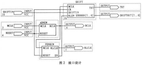 在圖2中,輸入為MCLK(主時(shí)鐘)、RESET(啟動(dòng)信號(hào))和SHIFTIN(A/D輸出數(shù)據(jù)),輸出為RL(左右?guī)盘?hào))、BCLK(A/D數(shù)據(jù)位時(shí)鐘),TXT(并行數(shù)據(jù)讀取控制)和SHIFTOUT(并行數(shù)據(jù)輸出)。通過(guò)時(shí)鐘控制輸出BCLK和 RLCLK到AD1871,AD1871傳出數(shù)據(jù)SHIFTIN進(jìn)入SHIFT模塊,SHIFT模塊在正確的位時(shí)鐘下讀取SHIFTIN的輸入數(shù)據(jù),并進(jìn)行串,并轉(zhuǎn)換,之后輸出8位或12位的數(shù)據(jù)。同時(shí)輸出TXT并行數(shù)據(jù)讀取控制。