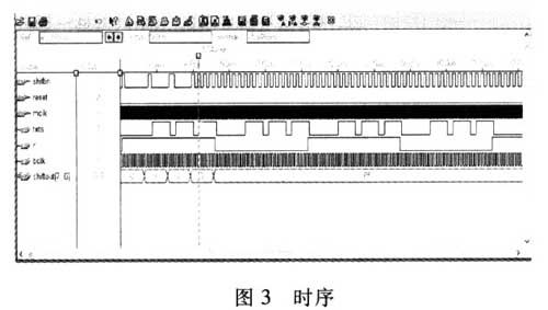 筆者用MaxPlus II對(duì)以上設(shè)計(jì)進(jìn)行仿真后得到圖3所示的時(shí)序圖,完全滿足設(shè)計(jì)要求,從圖3可以看出串行輸入的數(shù)據(jù)(shiflin)變成并行的數(shù)據(jù)(shiftout) 輸出,在此過(guò)程中數(shù)據(jù)延時(shí)8個(gè)周期,每個(gè)txts的上升沿提取數(shù)據(jù)能保證數(shù)據(jù)的正確性。因?yàn)閺臄?shù)據(jù)的變動(dòng)到txts的上升沿有400ns,大于FPGA的數(shù)據(jù)建立時(shí)間(25ns~50ns),可以保證提取數(shù)據(jù)的正確性。