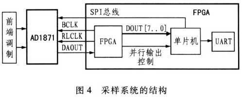圖4示出采用ADl871構(gòu)成的采樣系統(tǒng)結(jié)構(gòu)。整個(gè)系統(tǒng)在1個(gè)FPGA上實(shí)現(xiàn),分為3部分:并轉(zhuǎn)換模塊;ADC控制和配置;UART通信。