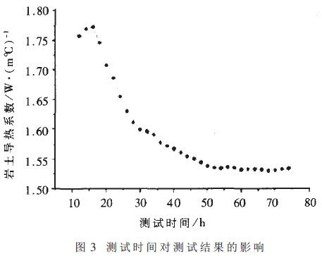 測(cè)試時(shí)間對(duì)測(cè)試結(jié)果的影響如圖3所示。由圖3可以看出,測(cè)試時(shí)間不同,計(jì)算出的鉆孔周圍地下巖土的平均導(dǎo)熱系數(shù)也不同。當(dāng)測(cè)試時(shí)間達(dá)到約50小時(shí)后,測(cè)出的導(dǎo)熱系數(shù)趨于穩(wěn)定,維持在1.530~1.538 W/m℃的范圍之間。通常測(cè)試時(shí)間可以選取60小時(shí)左右,這樣既可以保證獲得正確的導(dǎo)熱系數(shù),又可以避免測(cè)試時(shí)間過長。