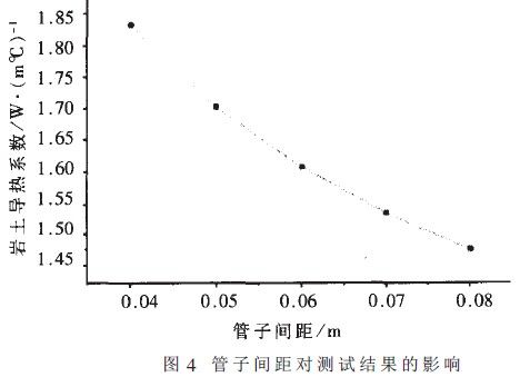 維持其它條件不變,只改變導(dǎo)管上升管與下降管之間的間距,其對(duì)巖土導(dǎo)熱系數(shù)的影響見圖4。當(dāng)管間距變化約為0.0lm時(shí).計(jì)算出的導(dǎo)熱系數(shù)變化約為4~8%。由圖中可以看出,間距越大,計(jì)算出的導(dǎo)熱系數(shù)越小:這是由于間距越大,鉆孔內(nèi)的熱阻越小,在總熱阻不變的情況下.周圍巖土的導(dǎo)熱熱阻大。即導(dǎo)熱系數(shù)小。因此如何確定管于間距是設(shè)計(jì)地源熱泵系統(tǒng)中值得認(rèn)真探討的問題。
