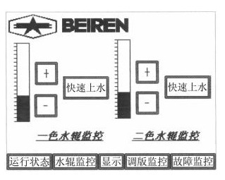 在人機(jī)界面中,設(shè)計(jì)了7幅畫面,包括整體圖形,故障顯示,機(jī)器速度和計(jì)數(shù)顯示,水輥速度顯示,調(diào)版監(jiān)控等。故障顯示使用指示器,給出位元件即可實(shí)現(xiàn)閃動(dòng)效果,讓操作者很方便的知道故障部位,整體感很好。在水輥速度顯示中,設(shè)計(jì)了一個(gè)柱狀圖,可以顯示水量增加大小,只需按下柱狀圖,就可增加水量,同時(shí)也可方便監(jiān)控。如圖所示: