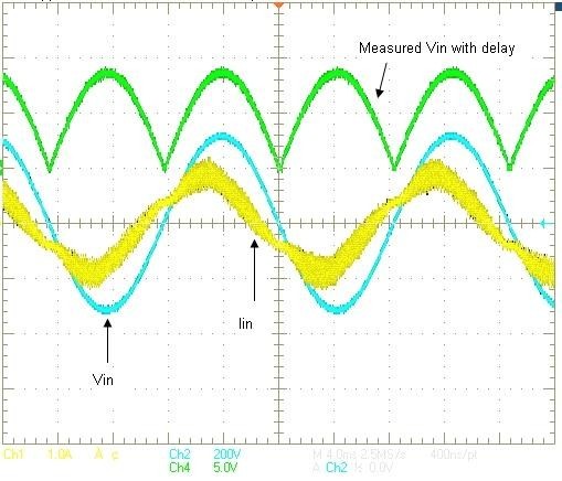 首先,輸入AC電壓通過ADC測(cè)量。固件讀取測(cè)量到的電壓信號(hào),再加上一些延遲,然后使用延遲后的信號(hào)來生成電流參考。圖7、8顯示了1100W無橋PFC的測(cè)試結(jié)果。在該測(cè)試中,VIN=220V,VOUT=360V,而負(fù)載=108W(約滿載的10%)。通道1為IIN,通道2為VIN,通道4為帶延遲的測(cè)量到的VIN信號(hào)。圖7中,測(cè)量到的VIN沒有增加延遲,PF=0.86,THD=8.8%.而在圖8中,測(cè)量到的VIN信號(hào)被延遲了300us,這種情況下,PF被改善到0.90.此外,還可以進(jìn)一步改善PF,但這將以犧牲THD為代價(jià),因?yàn)檫M(jìn)一步延遲電流參考,將在AC電壓交叉點(diǎn)處產(chǎn)生更多的電流失真。在圖9中,測(cè)量到的VIN被延遲了500us,此時(shí),PF被改善到0.92.但是,電流在電壓交叉點(diǎn)處出現(xiàn)了失真。結(jié)果,THD變得更糟糕,達(dá)到11.3%.