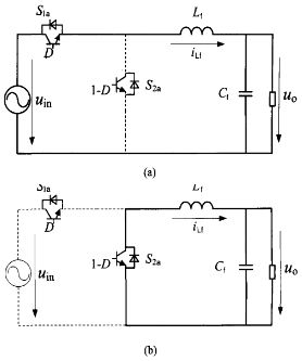 當(dāng)開關(guān)管S1a開通、S2a關(guān)斷時,輸入電壓通過開關(guān)管S1a的反向二極管、電感Lf給電容Cf和負(fù)載供電,如圖3(a)所示;當(dāng)開關(guān)管S1a斷開,S2a開通時,電感電流iLf經(jīng)Lf、開關(guān)管S2a、Cf和負(fù)載續(xù)流,Lf和Cf共同向負(fù)載供電,如圖3(b)所示。