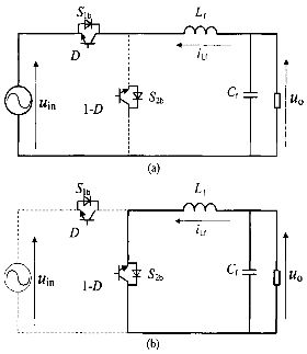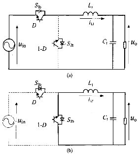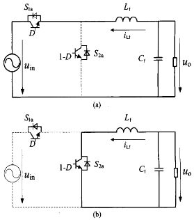 當(dāng)開關(guān)管S1b開通、S2b關(guān)斷時,輸入電壓通過開關(guān)管S1b的反向二極管、電感Lf給電容Cf和負(fù)載供電,如圖5(a)所示;當(dāng)開關(guān)管S1b斷開,S2b開通時,電感電流iLf經(jīng)Lf、Cf和負(fù)載、開關(guān)管S2b續(xù)流,Lf和Cf共同向負(fù)載供電,如圖5(b)所示。
