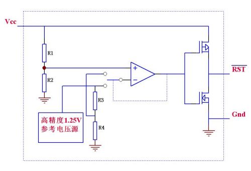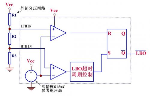 IC內(nèi)含一個高精度的615mV基準(zhǔn)電壓源、兩個比較器、一個RS觸發(fā)器和其它一些邏輯電路,其大致功能是:VCC電壓或其它待檢測電壓通過R1-R3組成的分壓網(wǎng)絡(luò)接在IC的LTHIN /HTHIN檢測引腳,當(dāng)待測電壓下降導(dǎo)致LTHIN引腳低于615mV時,輸出腳LBO輸出低電平,而如果待測電壓上升導(dǎo)致HTHIN引腳高于615 mV時,經(jīng)過內(nèi)部邏輯判斷和簡單延時后,輸出腳LBO輸出高電平。