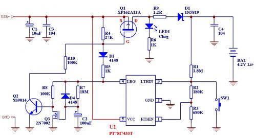 乍看之下,這個方案采用了三個IC,可是U1和U2是采用的SOT-23或者TO-92封裝,就好像普通三極管一樣,其價格也就是2-3個三極管的價格,而U3(PT8A2513NE)也是采用的TO-94封裝,外形和三極管很相似,價錢也相當(dāng)便宜,不過,這個電路可以實(shí)現(xiàn)智能判斷電池是否過放電,決定是否在開始充電時采用小電流預(yù)充,另外,采用U3后也將充電后期的補(bǔ)充充電過程延長到大約一個小時!