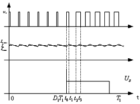 3)f1=f2,適當(dāng)?shù)南婋x寬度和脈寬組合能夠使得前后級變換器的頻率相等。由于前后級工作時鐘的任意性,考慮到最惡劣情況,假設(shè)在前級續(xù)流時,后級S關(guān)斷,放電加工。波形如圖4所示。和以上分析方法相同,保證后級在一個周期內(nèi)所需的能量全部由電感儲能提供,如果電感儲能過少,將導(dǎo)致前級輸出電流下降較大,使之在下一工作周期中調(diào)節(jié)占空比,直至占空比增加到一個適當(dāng)值,這樣,輸出電流波動大,對加工精度不利,因此,要求儲能電感要滿足式(5)能量約束關(guān)系。