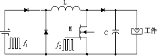 圖1為前、后級變換器的主電路圖。其中電容C的值很小,它的作用是高壓引弧放電。具體工作過程是這樣的:當(dāng)開關(guān)S關(guān)斷時,由于工件還處于開路狀態(tài),所以電感L中的大電流給C充電,致使工件兩端電壓線性急劇上升,直至高壓擊穿正常放電,此后,電流流經(jīng)工件進(jìn)行加工,一直延續(xù)到S開通時結(jié)束。假設(shè)前級變換器的開關(guān)頻率為f1,后級電子負(fù)載開關(guān)S的開關(guān)頻率為f2,那么f1和f2有以下4種情況。