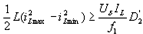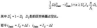為求出Lf1的確切值,必須對上述約束關(guān)系中的各個參數(shù)進(jìn)行代換。這里取平均值Uδ=25V;D′1=1-D1,在0~1之間變化,故取D′1max≈1;,取ΔI=0.02IL=0.02×20=0.4A;D′2=1-D2,由于在實際應(yīng)用中,一般要求消電離時間≥脈沖寬度,故取0.5≤D2<1,即0<D′2≤0.5,這里取D′2max=0.5。將上述各參數(shù)代入約束關(guān)系可得式(8)