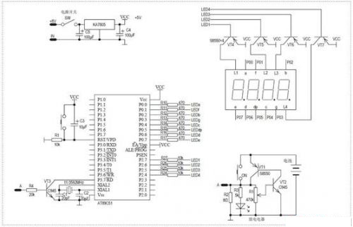 在實(shí)際電路中,L1就是第一只數(shù)碼管的共陽(yáng)極端。單片機(jī)的輸出、輸入接口數(shù)量都很有限,所以4位LED數(shù)碼管驅(qū)動(dòng)都是使用動(dòng)態(tài)顯示的方式。4只獨(dú)立數(shù)碼管LED的內(nèi)部a、b、c、d、e、f、g、dp這8段發(fā)光管相對(duì)應(yīng)的陰極都是并連的。統(tǒng)一由單片機(jī)P0口8位輸出進(jìn)行驅(qū)動(dòng)。數(shù)碼管要顯示出數(shù)碼還必須在共陽(yáng)極端同時(shí)施加正電壓才行。所以要讓4位中某一數(shù)碼管進(jìn)行顯示,只要在P0口輸出字型碼的同時(shí),給這位數(shù)碼管共陽(yáng)極端加上正電壓就行了,當(dāng)然與此同時(shí)其他三位數(shù)碼管的共陽(yáng)極端要保持低電壓,才不致顯示出現(xiàn)混亂。數(shù)碼管共陽(yáng)極端驅(qū)動(dòng)電流較大,所以采用了三極管進(jìn)行控制。以第一只數(shù)碼管為例,在P0端口輸出字型碼的同時(shí),P37輸出低電平,三極管T4導(dǎo)通,則共陽(yáng)極端L1就得到高電平了,數(shù)字就會(huì)顯示在第一只數(shù)碼管上了。