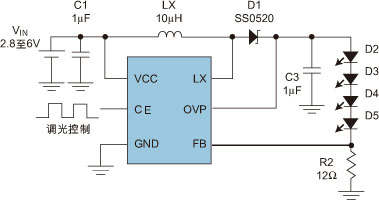 圖1:Step-UP DC/DC 開關電源實現LED驅動的典型應用線路。