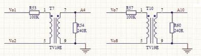 此系統輸出是三相交流電,輸出線電壓為380V,故選擇TV19E電壓互感器,其輸出負載電阻可以接0~500Ω,輸出交流電壓0~2.5V,此系統采用240歐的電阻,輸出電壓為-1.2V~1.2V。滿足DSP的輸入要求。電路如圖3所示。