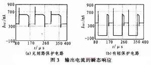 圖3(b)所示曲線的仿真條件與圖3(a)的條件一樣。仿真結(jié)果表明當(dāng)輸出發(fā)生短路時(即負(fù)載為0),輸出電流被限制為O,即功率MOS管被完全關(guān)斷,同時表明系統(tǒng)具有自動恢復(fù)的特點(diǎn),即負(fù)載短路消除后,系統(tǒng)恢復(fù)正常工作。