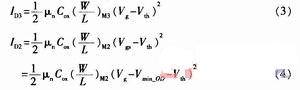 接下來將分析VM2、VM3和VM4組成的網(wǎng)絡(luò)如何確保Vmin_OD大于0。分析電路可知,VM2、VM3工作在飽和區(qū),VM4工作在線性區(qū),因此ID3>ID4,ID4=ID2。