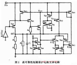 在限流電路的基礎(chǔ)上,設(shè)計(jì)改進(jìn)一個短路保護(hù)電路,確保在短路情況下,徹底關(guān)斷功率MOS管,減少短路發(fā)生時系統(tǒng)損失的功耗。同時該電路具有以下特點(diǎn):高可靠性、自動恢復(fù),即使地平面存在大量噪聲,當(dāng)短路發(fā)生時,穩(wěn)壓器的功率管截止,實(shí)現(xiàn)保護(hù),而短路一旦消除,穩(wěn)壓器的輸出將自動恢復(fù)到正常狀態(tài),有效地保護(hù)系統(tǒng)。在藍(lán)牙功率放大器電源管理電路中得到了很好應(yīng)用。