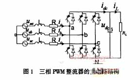 圖1是三相PWM整流器的拓樸結(jié)構,功率開關按采用的調(diào)制方式動作,由于輸入電感的濾波作用,整流器交流側(cè)可近似認為是三相正弦電流;直流側(cè)有大電容穩(wěn) 壓,輸出呈直流電壓源特性,穩(wěn)態(tài)時輸出直流母線電壓可保持不變,一般情況下,要求控制輸入電流與輸入電壓同相位,通常采用電壓外環(huán)和電流內(nèi)環(huán)的雙環(huán)控制方 式,電壓外環(huán)主要是保證直流輸出電壓穩(wěn)定,電流內(nèi)環(huán)主要是按電壓外環(huán)輸出的電流指令進行電流控制,如實現(xiàn)單位功率因素正弦波電流控制。