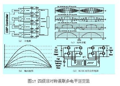 有些學者為非對稱混聯(lián)多電平逆變電路提出了主從逆變單元的概念。主逆變單元(master)就是串聯(lián)連接的逆變器中,直流電壓最高的單元,它承擔級聯(lián)逆變器大多數(shù)的功率,通常由gto、igct完成,同時通過dc/dc雙向功率電源向從逆變單元(slave)供電。其它的逆變單元稱為從逆變單元,直流電壓較低,只負責完成自己的逆變?nèi)蝿?wù)。圖17所示為(a)(b)(c)(d)分別為4級連接81電平的逆變器主電路、輸出波形、功率分配情況及dc/dc雙向功率電源。