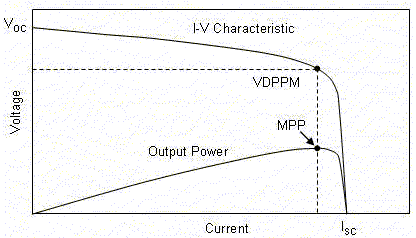 在大多數(shù)應(yīng)用中,人們期望從太陽(yáng)能電池獲取盡可能多的功率。因?yàn)檩敵龉β适禽敵鲭妷汉碗娏鞯某朔e,有必要確定電池的哪一部分的工作區(qū)域產(chǎn)生的輸出電壓和電流的乘積的數(shù)值最大,這一點(diǎn)被稱為最大功率點(diǎn)(MPP)。在一種極端情況下,輸出電壓為其最大數(shù)值(VOC),但是,輸出電流為零;在其它極端情況下,輸出電流位其最大值(ISC),但是,輸出電壓為零。在兩種情況下,輸出電壓和電流的乘積都是零。因此,MPP必須位于兩種極端情況之間的某處。