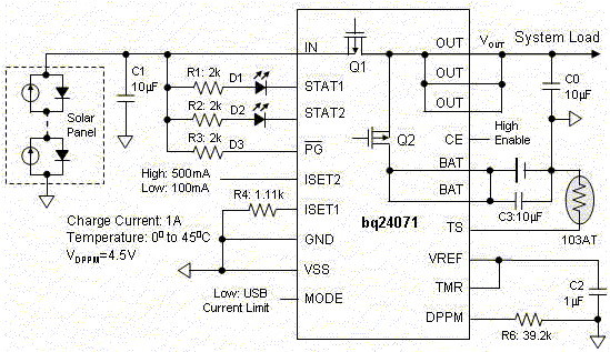 從這個(gè)太陽(yáng)能板獲得的最大輸出電壓(VOC)通常在5.5V到6V之間。因?yàn)樵撾妷旱陀陬A(yù)設(shè)的6V輸出調(diào)節(jié)電壓,MOSFET Q1被完全關(guān)閉。如果系統(tǒng)和電池充電器所需要的總電流超過太陽(yáng)能電池的輸出電流—取決于光線強(qiáng)弱—能力,太陽(yáng)能板的輸出電壓將下跌,從而使輸出電壓(VOUT)下降。當(dāng)VOUT下降到VDPPM—也是太陽(yáng)能板的輸出電壓—的時(shí)候,充電電流就下降了。太陽(yáng)能板現(xiàn)在將在接近其MPP的狀態(tài)下工作,如果VDPPM被設(shè)置為接近MPP的話。通過恰當(dāng)?shù)匕裄DPPM編程到一個(gè)電平,就容許VOUT保持在最小的4.5V,從而實(shí)現(xiàn)這一點(diǎn)。這個(gè)VDPPM數(shù)值就被人們所采用,因?yàn)樗喈?dāng)符合太陽(yáng)能板的MPP。