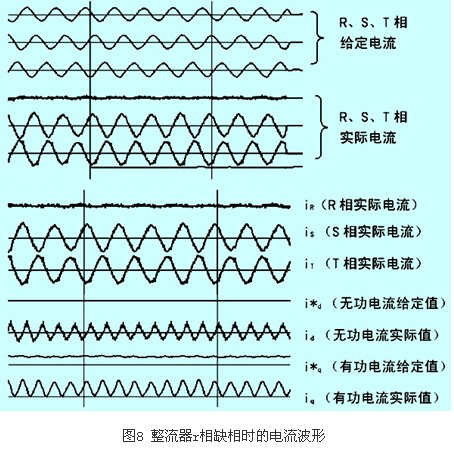 如果由于線路缺相,CT也檢測(cè)不到電流(例如r相電流ir=0),則由于平衡控制會(huì)使另外兩相電流的相位差變?yōu)?80°,幅值相等(當(dāng)然為補(bǔ)償“缺相”的那相電流,另兩相電流將增大),以滿(mǎn)足矢量和為零的控制要求,如圖8所示。此時(shí),根據(jù)r、s、t相實(shí)際電流計(jì)算出的有功分量電流iq和無(wú)功分量電流id已經(jīng)不是正常直流量,而是含有2倍頻(相電流頻率)成份的交流量,參見(jiàn)圖8,整流器無(wú)法正常工作。