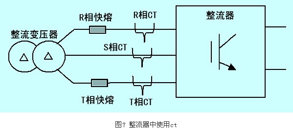 整流器中電流檢測(cè)元件采用的是nnc系列有源電流互感器(簡(jiǎn)稱(chēng)CT),整流器中使用CT情況如圖7所示。