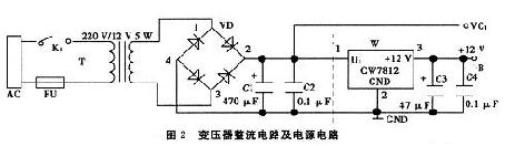 變壓器整流電路和穩(wěn)壓電源電路(如圖2虛線左邊所示),其主要由變壓器、二極管橋式電路、電容構(gòu)成。其中變壓器采用常規(guī)的鐵心變壓器,并將公共電網(wǎng)中的220 V交流電變?yōu)?2 V交流電,再通過二極管橋式電路進(jìn)行整流和電容C1濾波。整流信號由VC1引出。在此基礎(chǔ)上再接三端穩(wěn)壓器CW7812及電容C3、C4(如圖2虛線右邊所示),這樣整個電路就構(gòu)成穩(wěn)壓電源電路。由B點(diǎn)提供+12 V的直流電壓。