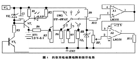如圖4電路所示,自動斷電電路是由三極管VT2、電壓跟隨器A1、電壓比較器A2電阻R4、R5、R6、R7、R8、R11和可變電阻RP1構(gòu)成。當(dāng)充電開始時,電壓比較器輸出高電平,VT2導(dǎo)通,VT1也導(dǎo)通,指示燈發(fā)光二極管亮,給電池充電。可以先設(shè)定轉(zhuǎn)換開關(guān)為1時給一節(jié)電池充電,轉(zhuǎn)換開關(guān)為2時給二節(jié)電池充電,依次類推,實(shí)現(xiàn)對1-4節(jié)電池充電。當(dāng)電充滿時,電壓比較器輸出低電平,VT2截止,VT1不導(dǎo)通,發(fā)光二極管熄滅,充電完畢。[page]