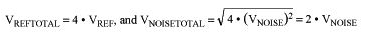 多個基準源串聯可以降低LF噪聲。使用多個電壓源(每個電壓源等效于一個直流源和一個噪聲源)時,直流電壓線性增加,噪聲源(如果非相關)則是以RMS幾何求和。例如,使用四個基準源,每個基準源等效于一個VREF基準和一個VNOISE噪聲,則產生如下輸出: