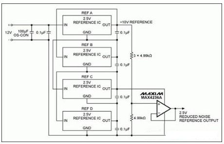 圖1. 由四路2.5V基準源串聯產生10V電壓,輸出分壓后得到2.5V,可使噪聲電壓減半。