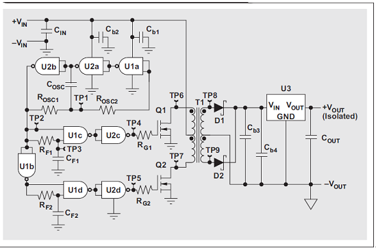 如果應用要求 2 kV 以上的隔離電壓、60% 以上的轉換器效率或者標準組件可靠的有效性,那么分立設計就是一種能夠替代集成組件的低成本方案。分立 DC/DC 轉換器設計的缺點是需要做大量的工作——選擇穩定的振蕩器結構和先斷后通電路,選擇可以通過標準邏輯門有效驅動的MOSFET,適宜實施溫度和長期可靠性測試。所有這些努力都要花費時間和資金。因此,在倉促進行這樣一個計劃以前,設計人員應該考慮到下列事項:集成組件通常已通過溫度測試,并且擁有其他工業資質。這些組件不僅僅是最可靠的解決方案,而且還擁有較快的上市時間。
