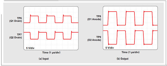 隔離變壓器 (T1) 擁有 2:1 的次級對初級匝數比、0.9 mH 的初級線圈電感,以及 3kV 的保證隔離電壓。圖 4 顯示了變壓器的輸入和輸出波形。