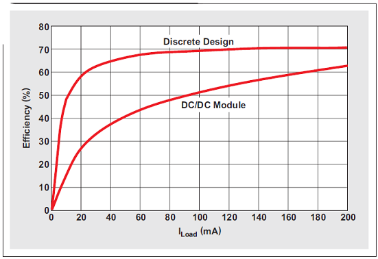 圖 5 顯示了 4.93 V 輸出電壓條件下圖 1 所示電路的紋波,而圖 6 將該電路的效率同具有穩定輸出的集成 DC/DC 組件進行了對比。