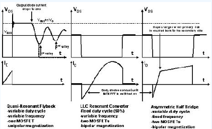 圖1所示為采用三種不同拓?fù)?準(zhǔn)諧振反激式拓?fù)洹LC諧振拓?fù)浜褪褂密涢_關(guān)技術(shù)的非對(duì)稱半橋拓?fù)?的開關(guān)的電壓和電流波形。